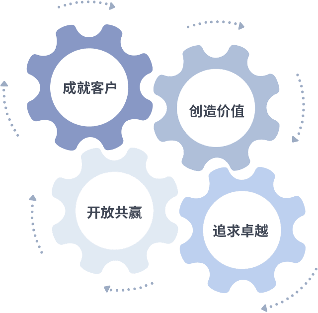 成就客户是一切决策的出发点,,创造价值是衡量所有工作的标准,,,,追求卓越是我们做事做人的态度,,,开放共赢是我们的格局也是最终的结果。。。价值观的齿轮环环相扣,,,,推动着组织里的每个人不断向前。。。
