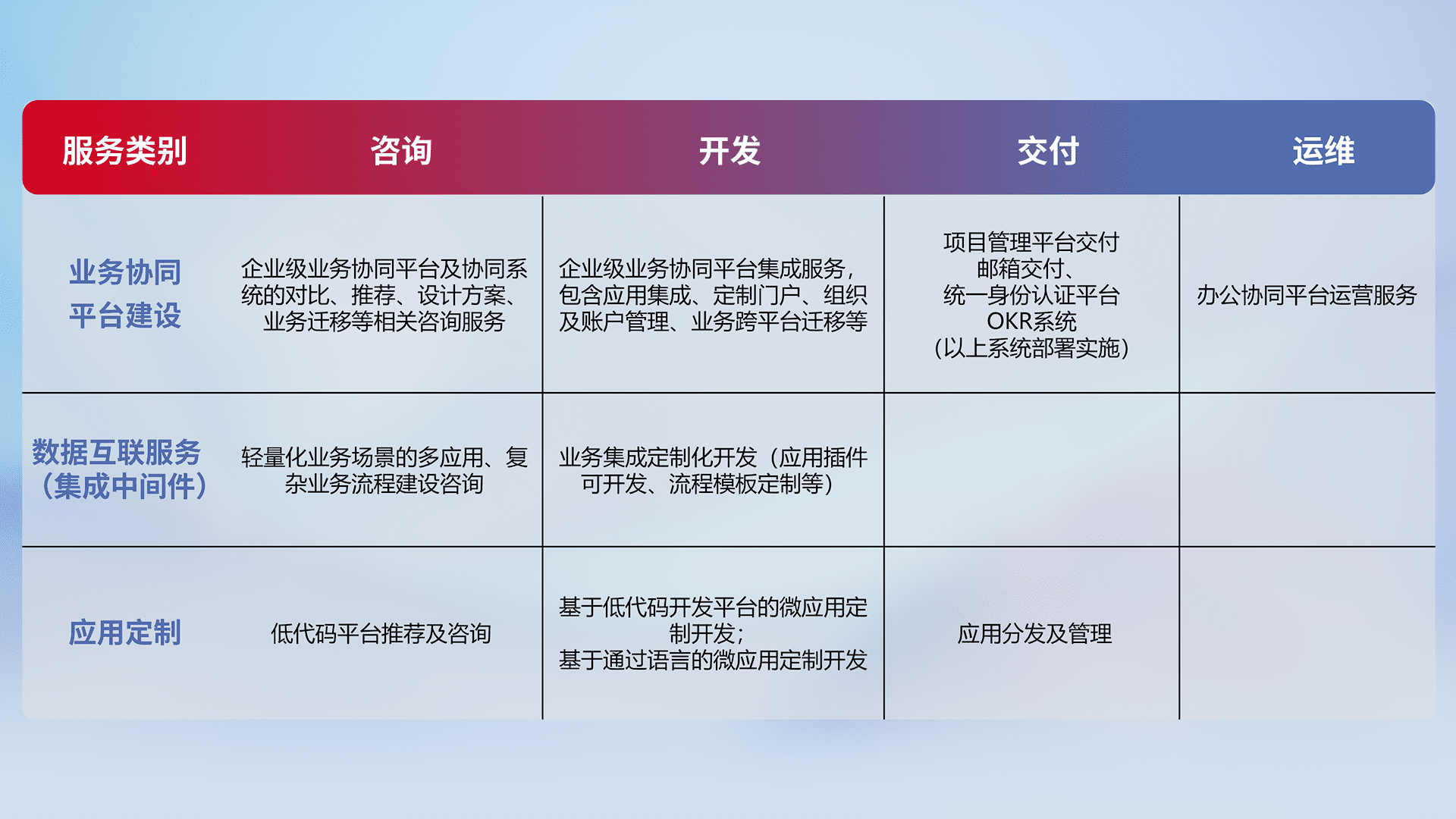 针对钉钉、、、企微、、、IDaas等平台级产品提供产品的规划、、方案、、交付、、、、定制化开发等服务,,,,实现如统一协同办公、、智能客户服务、、、混合会议管理、、、智能数据查询、、等业务场景,,,实现数字化转型。。。